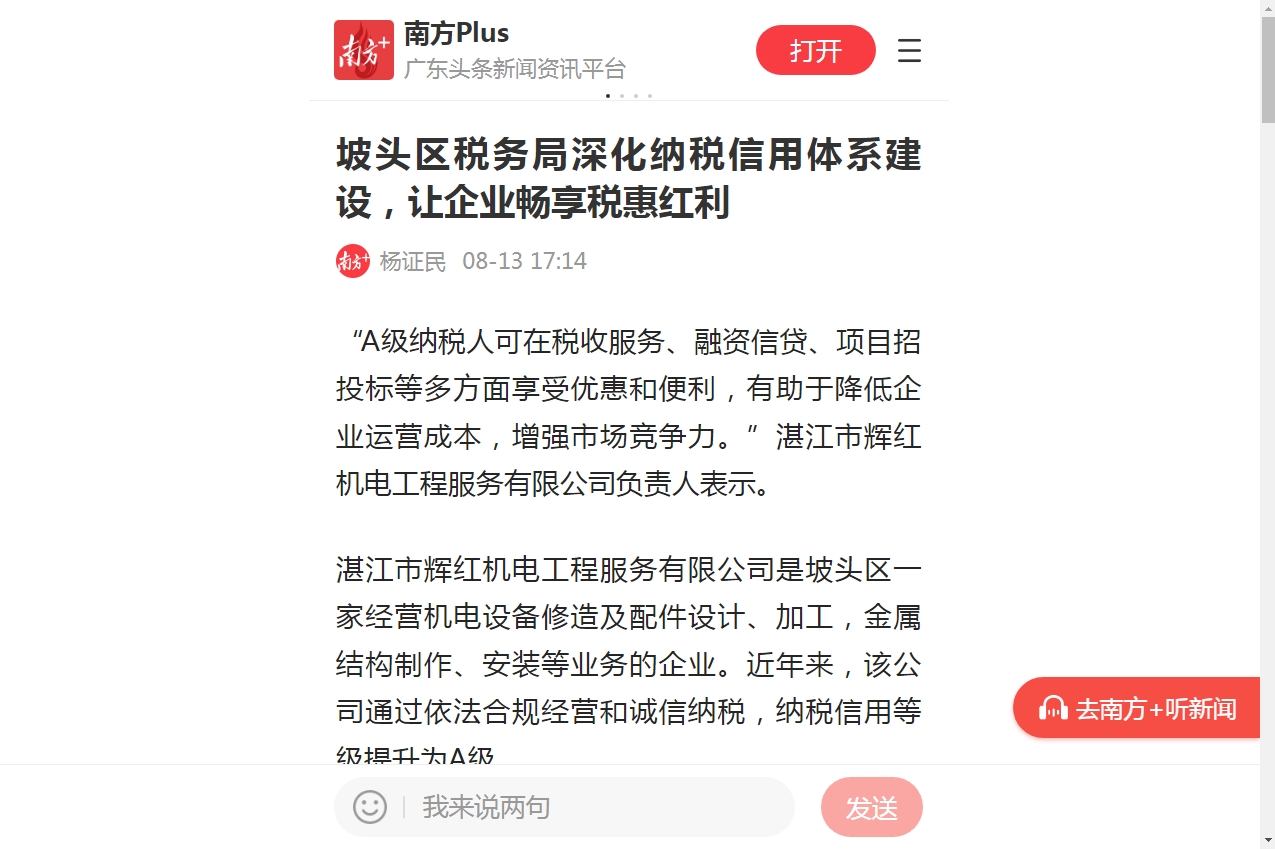 “A级纳税人可在税收服务、融资信贷、项目招投标等多方面享受优惠和便利,有助于降低企业运营成本,增强市场竞争力。”湛江市辉红机电工程服务有限公司负责人表示。
