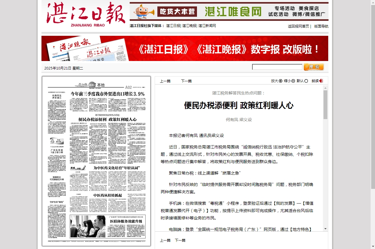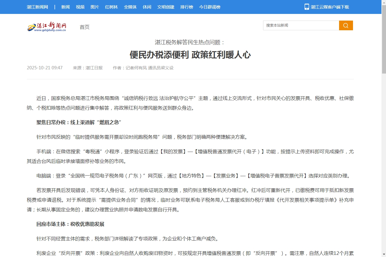 近日,国家税务总局湛江市税务局围绕“诚信纳税行致远 法治护航守公平”主题,通过线上交流形式,针对市民关心的发票开具、税收优惠、社保缴纳、个税扣除等热点问题进行集中解答,将政策红利与便民服务送到群众身边。