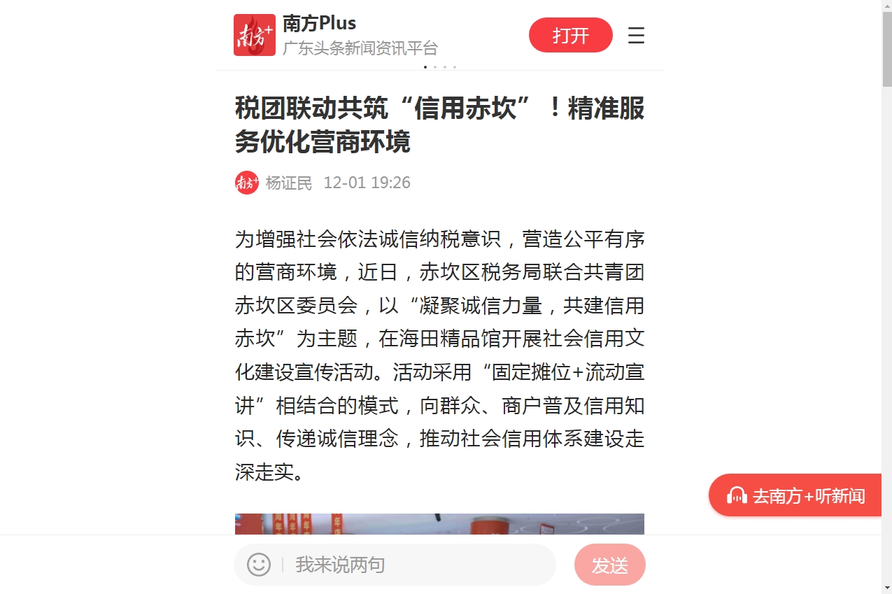 为增强社会依法诚信纳税意识,营造公平有序的营商环境,近日,赤坎区税务局联合共青团赤坎区委员会,以“凝聚诚信力量,共建信用赤坎”为主题,在海田精品馆开展社会信用文化建设宣传活动。活动采用“固定摊位+流动宣讲”相结合的模式,向群众、商户普及信用知识、传递诚信理念,推动社会信用体系建设走深走实。