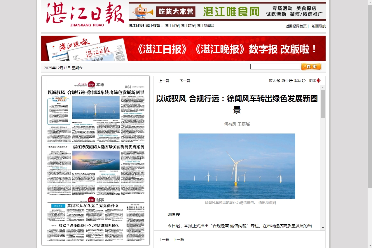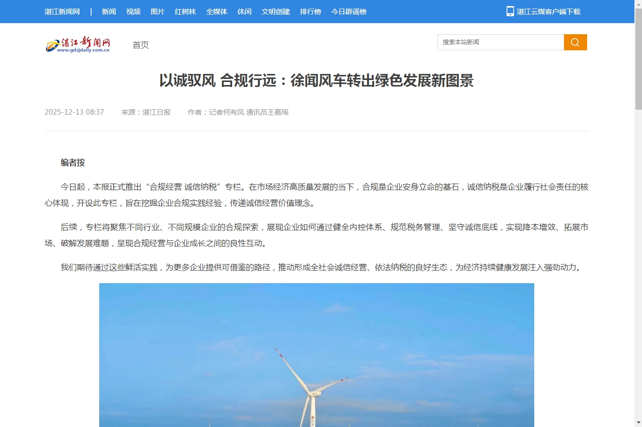 作为广东省重要的清洁能源基地,徐闻的风电产业不仅是地方经济的新增长极,更成为企业以诚信纳税为帆、以合规经营为桨,在政策东风中破浪前行的生动样本。从项目建设到市场拓展,从内控管理到税企协同,徐闻风电企业将合规基因融入发展血脉,让转动的风车不仅点亮万家灯火,更转出了绿色能源产业高质量发展的“徐闻答案”。