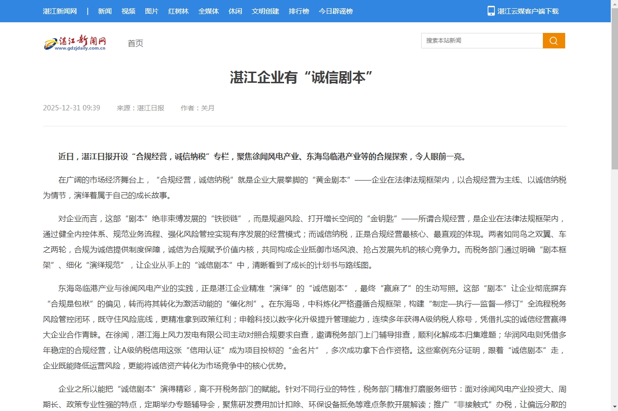近日,湛江日报开设“合规经营,诚信纳税”专栏,聚焦徐闻风电产业、东海岛临港产业等的合规探索,令人眼前一亮。