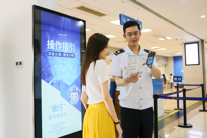 为推动解决预约办税“办什么”“哪里办”“怎么办”三大堵点难点问题,国家税务总局佛山市顺德区税务局联合当地政数、行服部门创新打造预约分流导办系统——数字导税员“德仔”,纳税人缴费人进入政务服务微信公众号,即可与“德仔”开展互动对话。截至目前,“德仔”在当地中心城区办税服务厅服务量已破万宗。图为税务人员向纳税人介绍“德仔”。