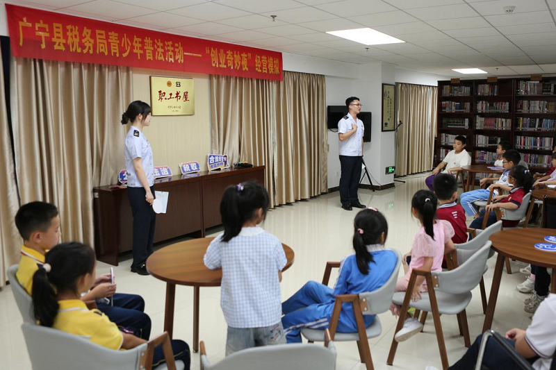 除了税法课堂,肇庆市税务部门也积极探索更多适合青少年普法的方式,在广宁,税务部门开展“创业奇妙夜”模拟经营体验活动,将青少年分成“企业组”和“税务组”,通过角色扮演体验税收全流程,在税务干部的引导下,沉浸式感受“诚信纳税”的意义。