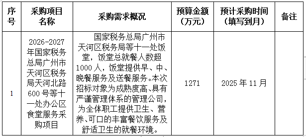 为便于供应商及时了解政府采购信息,根据《财政部关于开展政府采购意向公开工作的通知》(财库〔2020〕10号)等有关规定,现将国家税务总局广州市天河区税务局2025年10至12月采购意向公开如下: