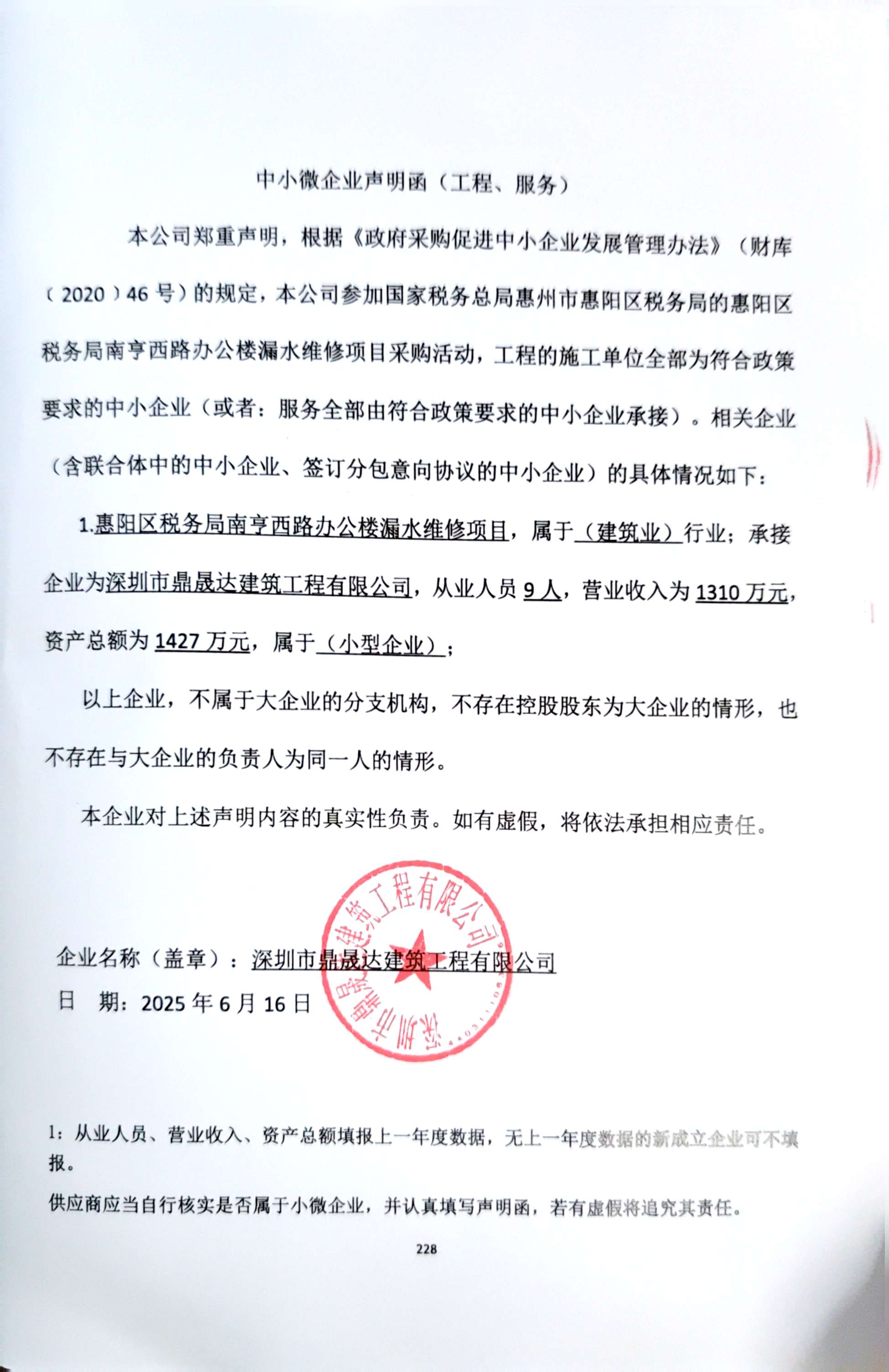 我局于2025年06月03日在国家税务总局惠州市惠阳区税务局网站发布了《惠阳区税务局南亨西路办公楼漏水维修项目磋商公告》。2025年06月16日惠州市嘉实招标代理有限公司受委托就本项目(项目编号:2025JS012)按规定程序进行开标、评标采购工作,在规定限期内参与投标的公司分别是:广东均兴建设工程有限公司、广东森盛华建设工程有限公司、深圳市鼎晟达建筑工程有限公司。经评标委员会按程序进行评审后,确定本项目中标方为深圳市鼎晟达建筑工程有限公司,中标金额:¥628,000.00(人民币陆拾贰万捌仟元整)。