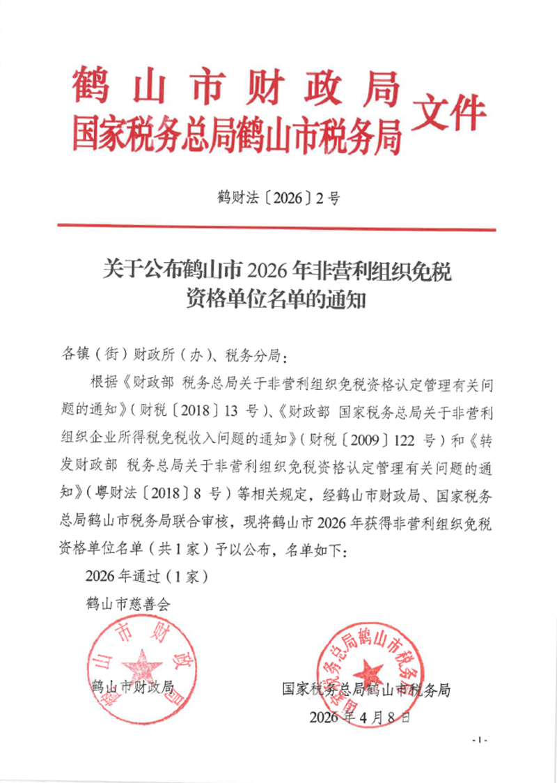 关于公布鹤山市2026年非营利组织免税资格单位名单的通知