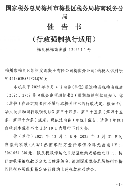国家税务总局梅州市梅县区税务局梅南税务分局催告书