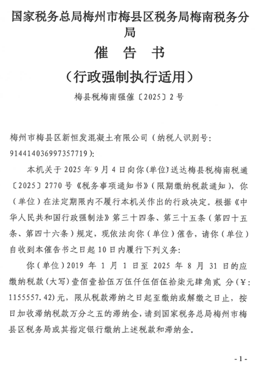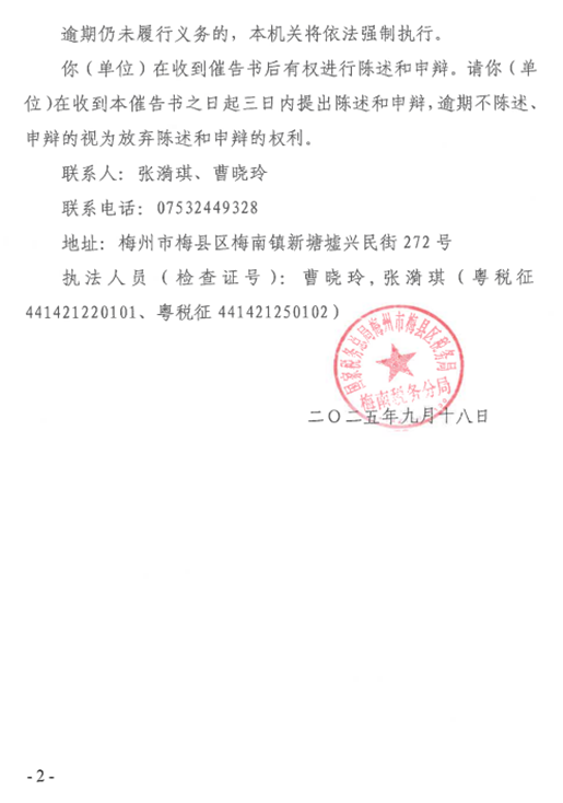 国家税务总局梅州市梅县区税务局梅南税务分局催告书