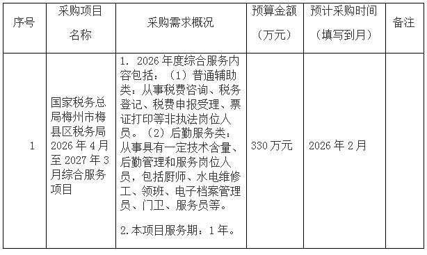 为便于供应商及时了解政府采购信息,根据《财政部关于开展政府采购意向公开工作的通知》(财库〔2020〕10号)等有关规定,现将国家税务总局梅州市梅县区税务局2026年4月至2027年3月综合服务项目采购意向公开如下: