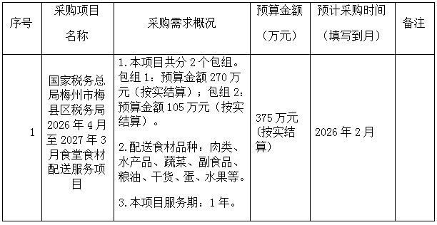 为便于供应商及时了解政府采购信息,根据《财政部关于开展政府采购意向公开工作的通知》(财库〔2020〕10号)等有关规定,现将国家税务总局梅州市梅县区税务局2026年4月至2027年3月食堂食材配送服务项目采购意向公开如下: