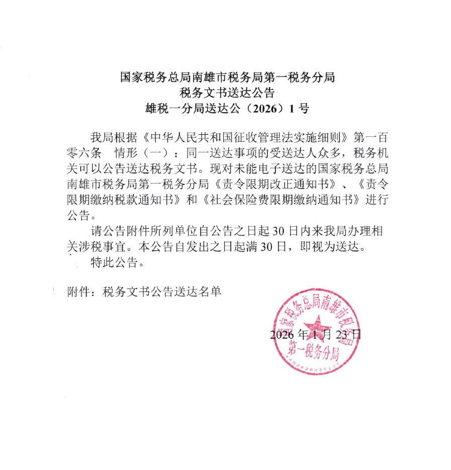 国家税务总局南雄市税务局第一税务分局税务文书送达公告