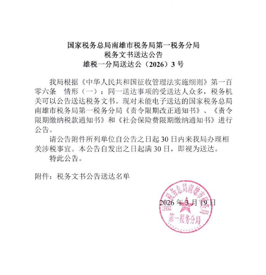 国家税务总局南雄市税务局第一税务分局税务文书送达公告
