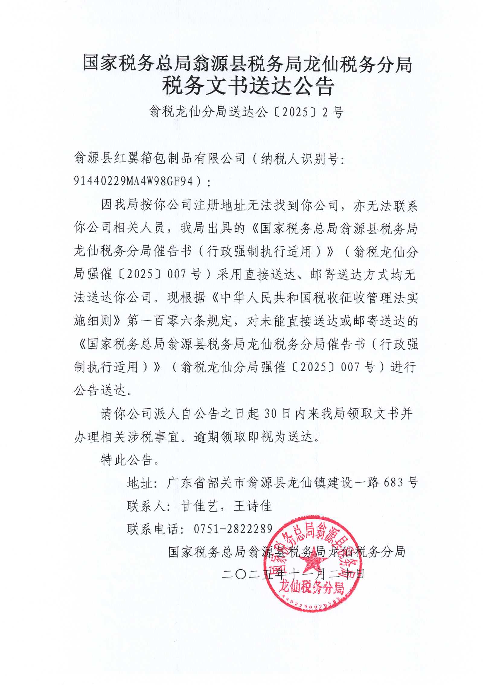 国家税务总局翁源县税务局龙仙税务分局税务文书送达公告