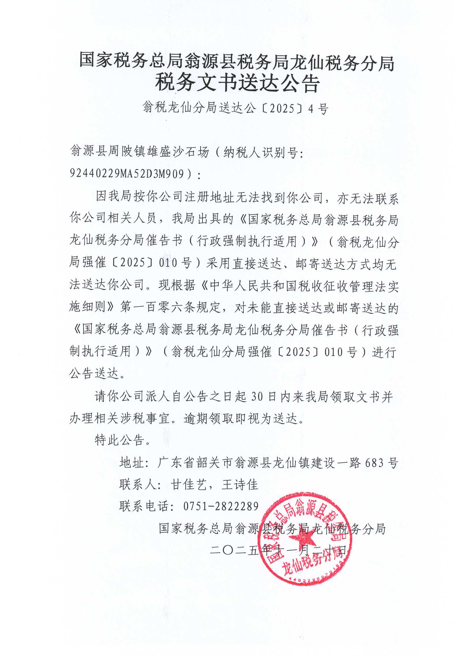 国家税务总局翁源县税务局龙仙税务分局税务文书送达公告