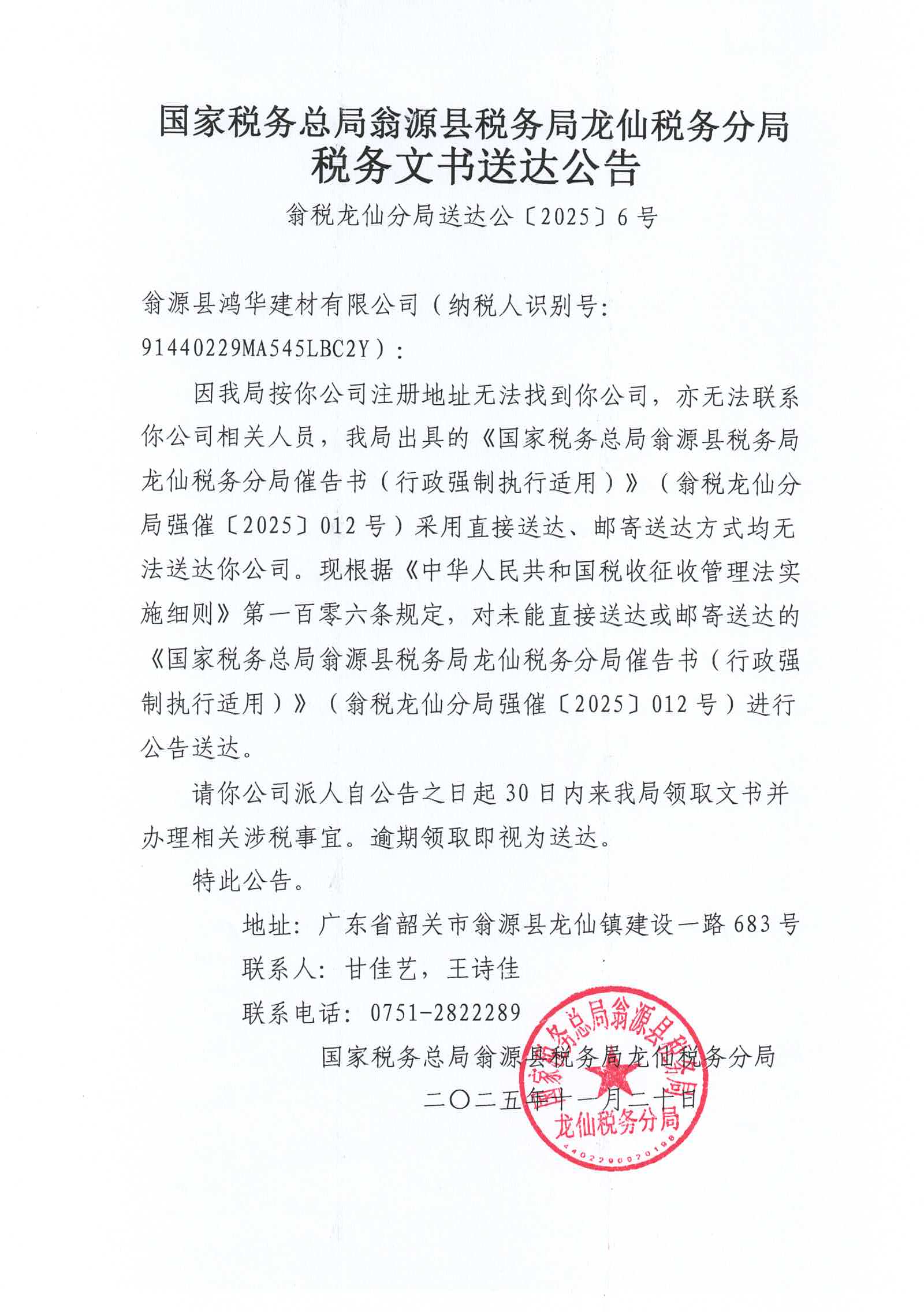 国家税务总局翁源县税务局龙仙税务分局税务文书送达公告