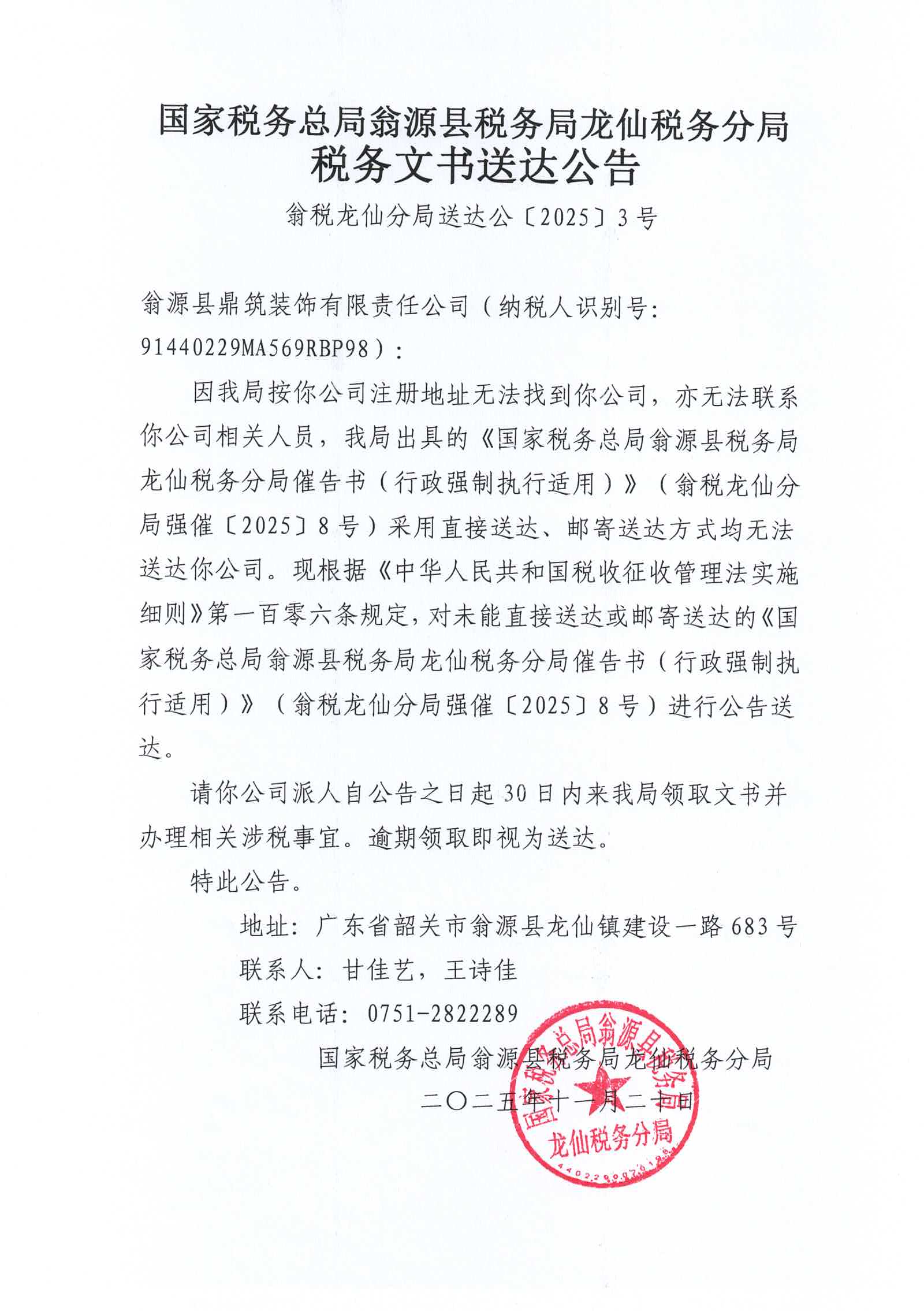 国家税务总局翁源县税务局龙仙税务分局税务文书送达公告