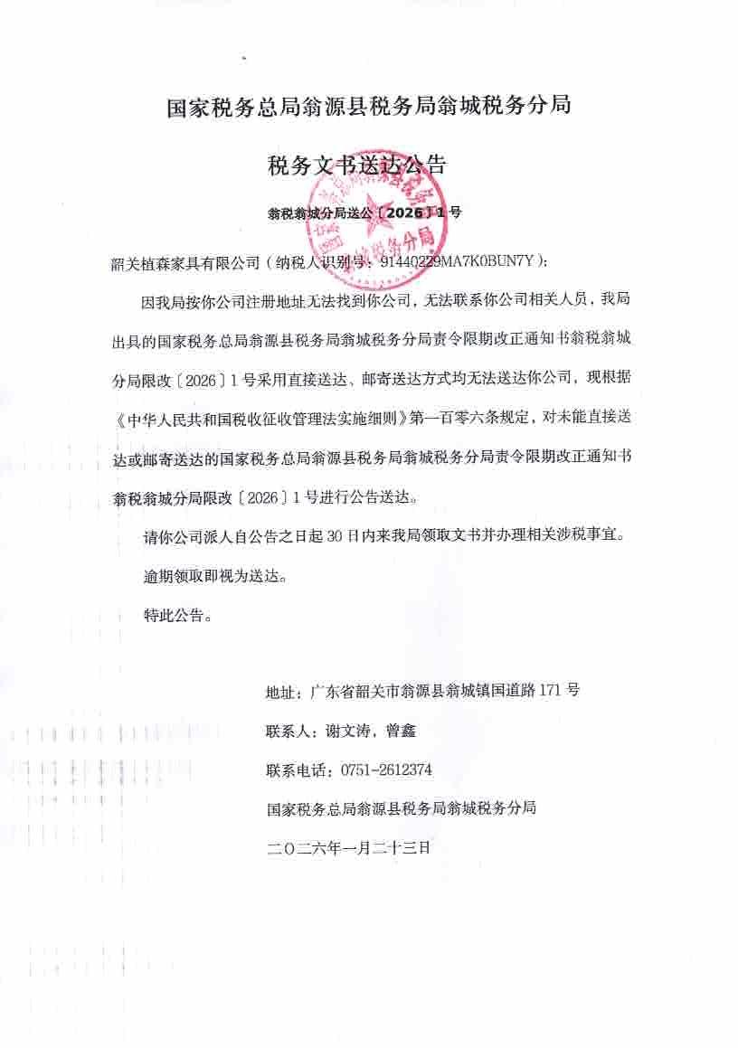 国家税务总局翁源县税务局翁城税务分局税务文书送达公告