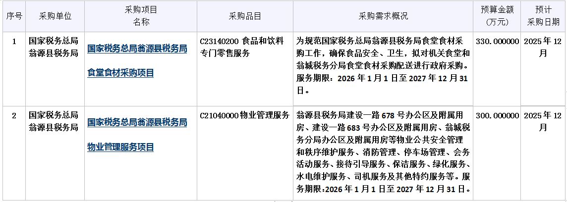 为便于供应商及时了解政府采购信息,根据《财政部关于开展政府采购意向公开工作的通知》(财库〔2020〕10号)等有关规定,现将国家税务总局翁源县税务局2025年10至12月政府采购意向公开如下: